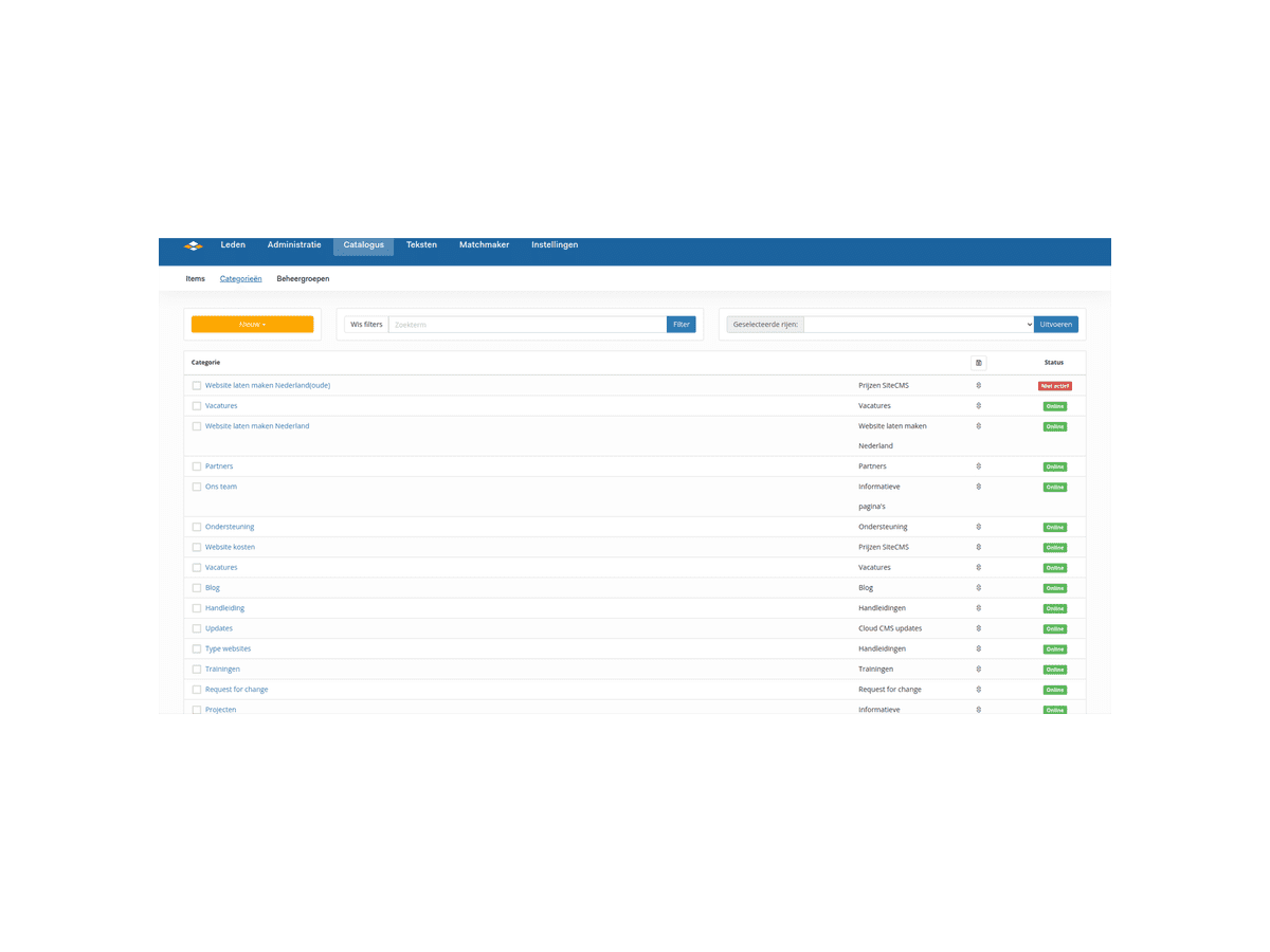 Voordat er items geplaatst kunnen worden in een beheergroep, moet er een categorie worden aangemaakt. Ook kan een beheergroep meerdere categorieën bevatten, wanneer deze dezelfde instellingen delen. Per categorie kunnen er aparte zoekfilters en sorteeropties worden aangemaakt. Bedenk daarom welke zoekfilters en sorteeropties er bij deze categorieën horen.