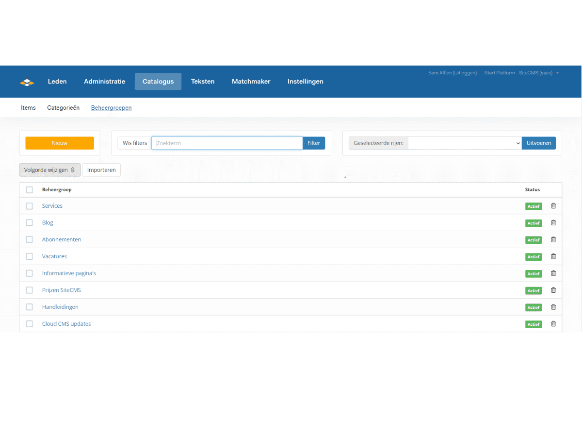 Per beheergroep kun je instellen of de onderliggende items op de homepage getoond mogen worden. Deze items worden dan altijd getoond onder de contentblokken van de homepage. Wanneer je meerdere beheergroepen toont op de homepage is het mogelijk om de volgorde te wijzigen via SiteCMS, dat doe je als volgt: