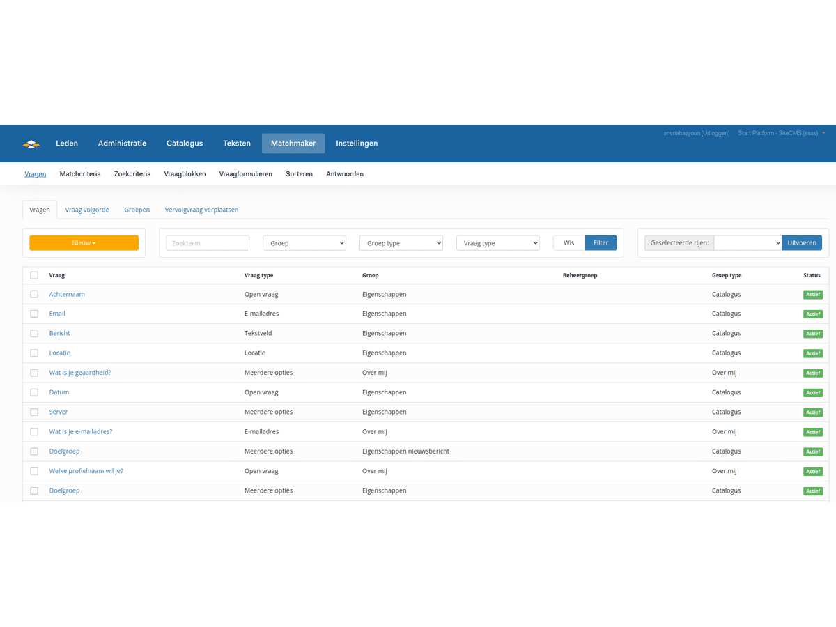 - Vragen. Als laatste zijn er de vragen zelf, deze kunnen bijvoorbeeld antwoordmogelijkheden bevatten. Deze kun je aanpassen bij vragen (Matchmaker>Vragen>vragen). De vragen die gekoppeld zijn kunnen verschillen. In het vraagformulier kun je zien welke vragen dit zijn.