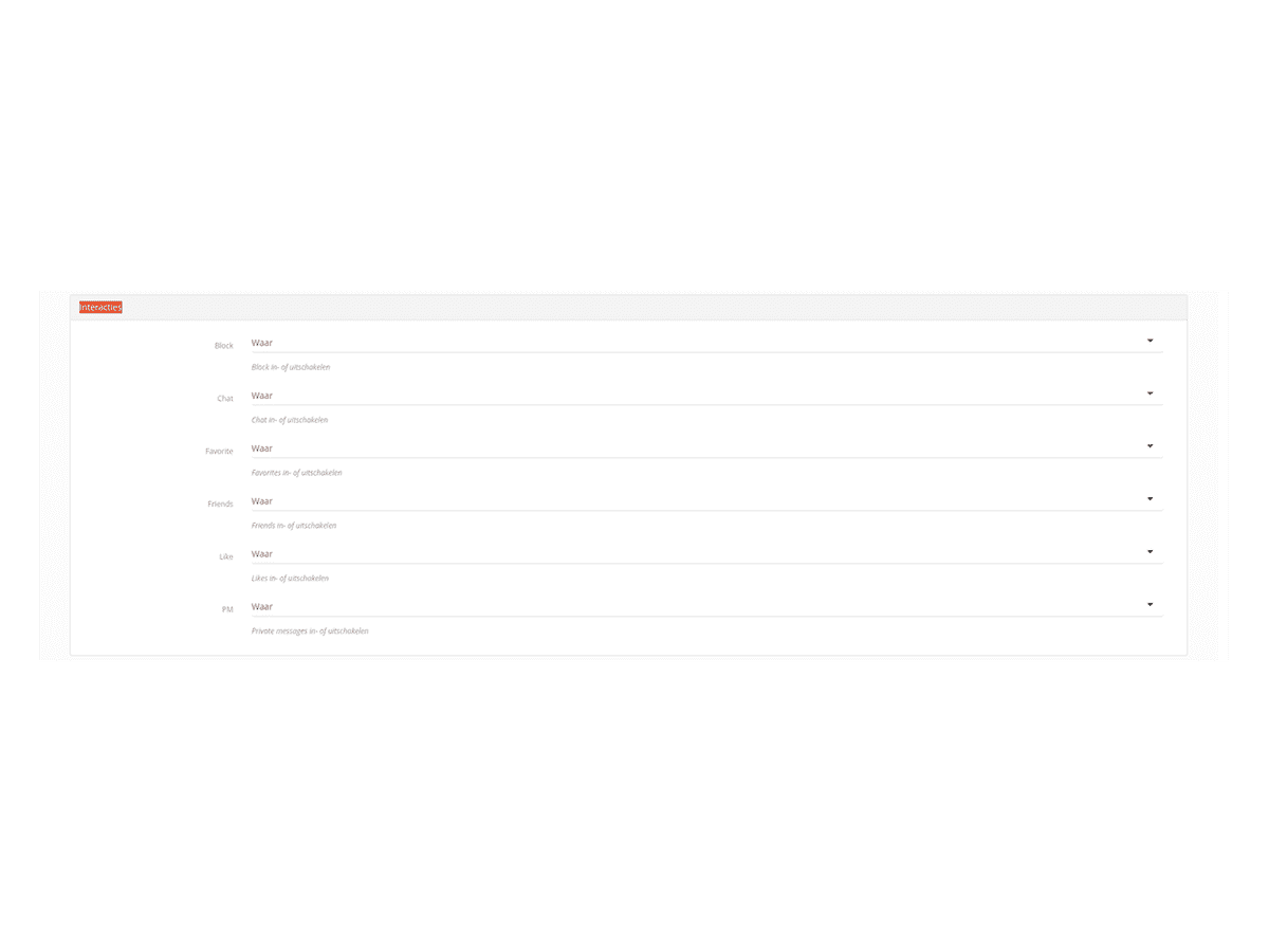 Tip: Zit je bepaalde interacties op niet waar, zorg er dan ook voor dat er geen menu items meer zijn die gerelateerd zijn aan deze opties. Bijvoorbeeld in het account menu staan opties zoals: Favorieten, vrienden en likes.