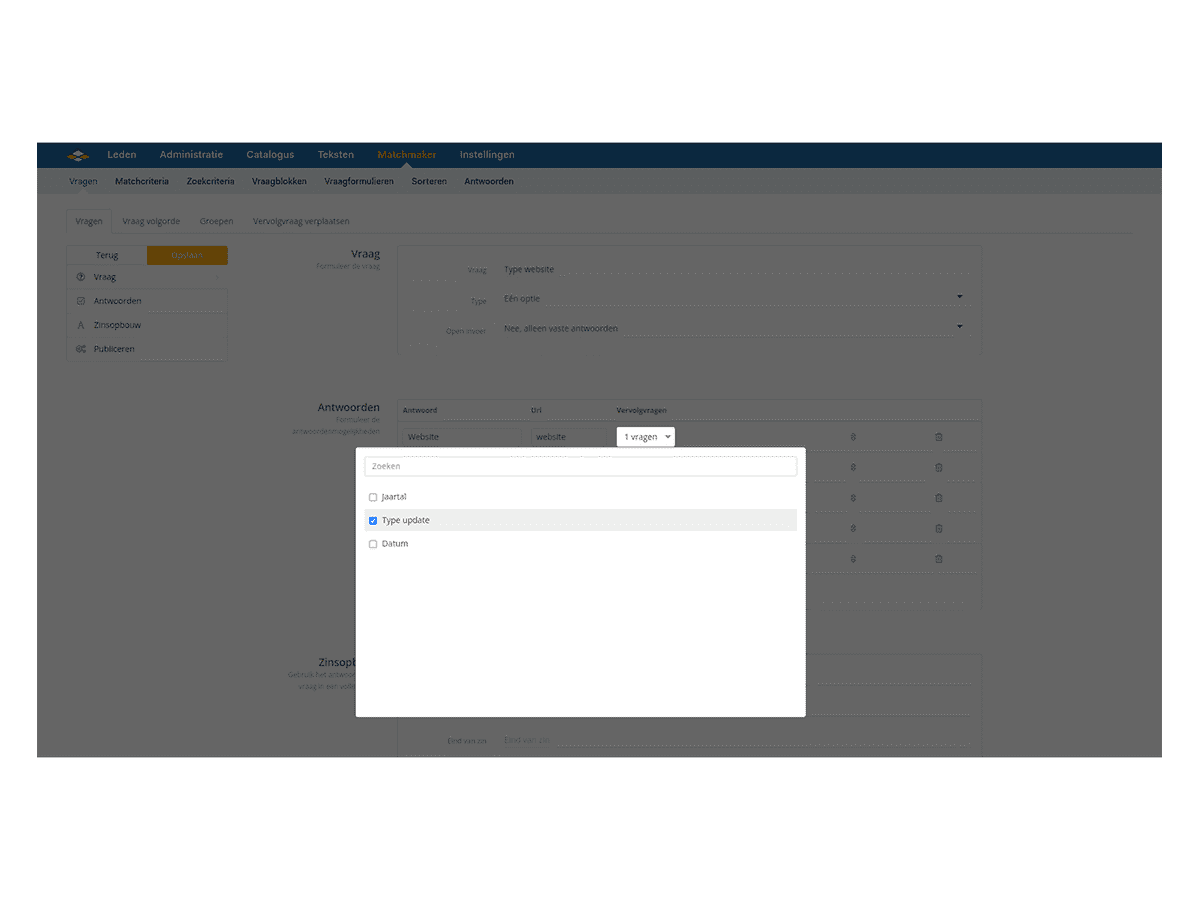 - Zorg ervoor dat alle vragen eerst als normale vragen zijn toegevoegd. Hiervoor ga je naar SiteCMS> Matchmaker> Vragen.