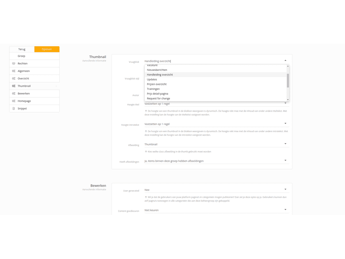 Per beheergroep kun je instellen welke vraagblok gebruikt wordt voor de thumbnail en voor de detailpagina. Voor de profielpagina staan deze standaard al gekoppeld en hoeft deze stap niet doorlopen te worden. Zorg ervoor dat eerst de beheergroep en de vraagblokken op de juiste manier zijn toegevoegd.