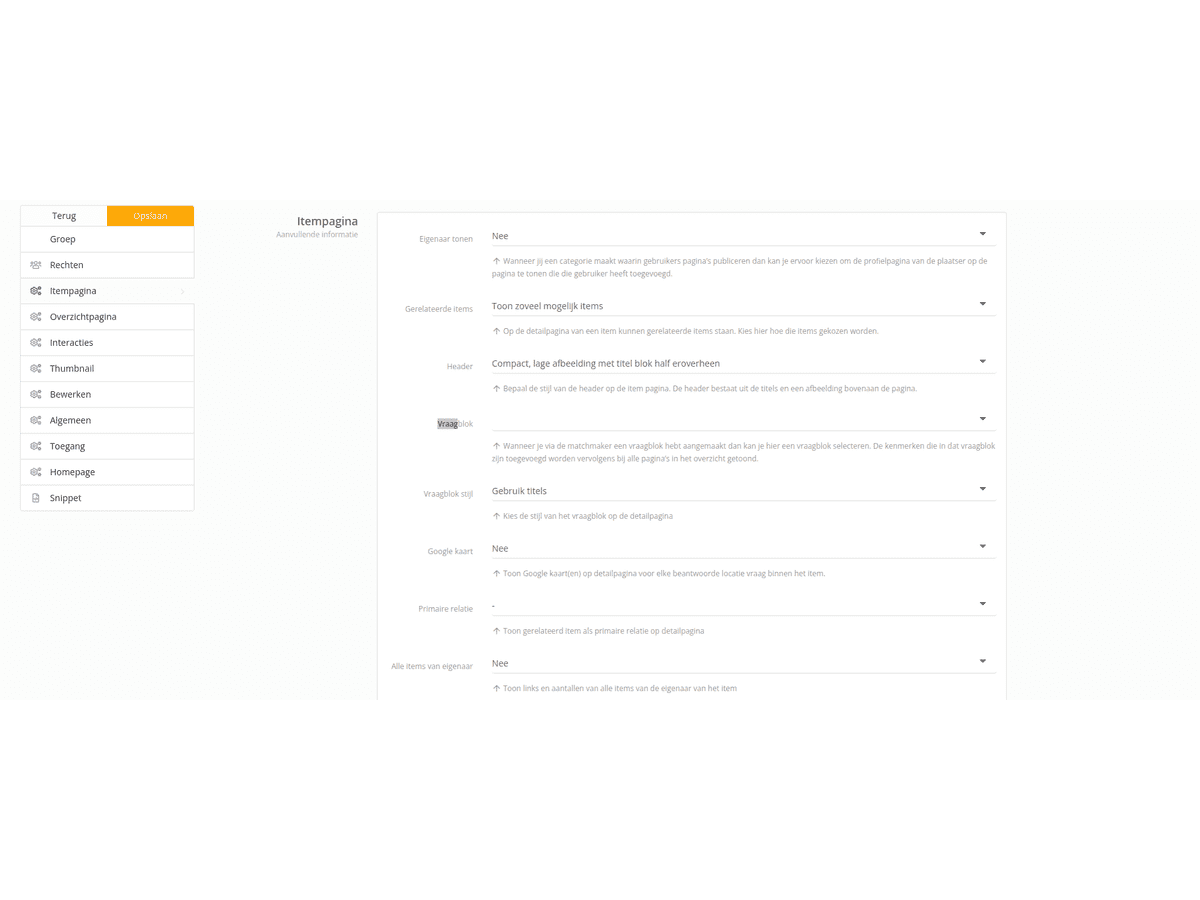 Tip: gebruik voor de overzichten eigenschappen die makkelijk te scannen zijn voor de bezoekers. Dit helpt ze met het makkelijk navigeren door je platform. Toon op de detailpagina’s de meer gedetailleerde eigenschappen.