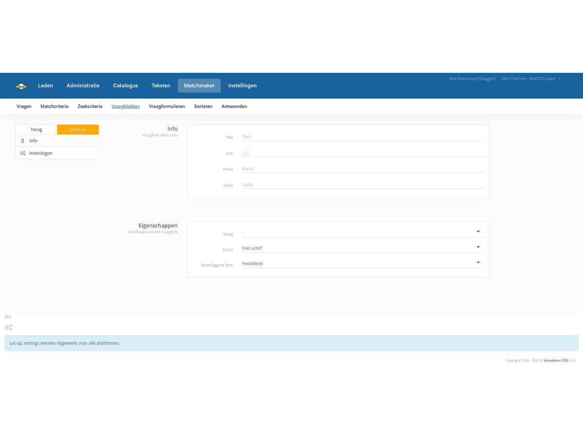 Eigenschappen kunnen op verschillende plaatsen op de website getoond worden. Bijvoorbeeld op de profielpagina, in het zoekoverzicht of in een categoriepagina. We tonen deze eigenschappen met vraagblokken. Deze bestaan dus voor de eigenschappen van profielen maar ook voor de eigenschappen van items uit een beheergroep.